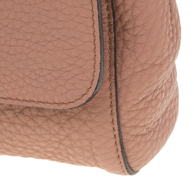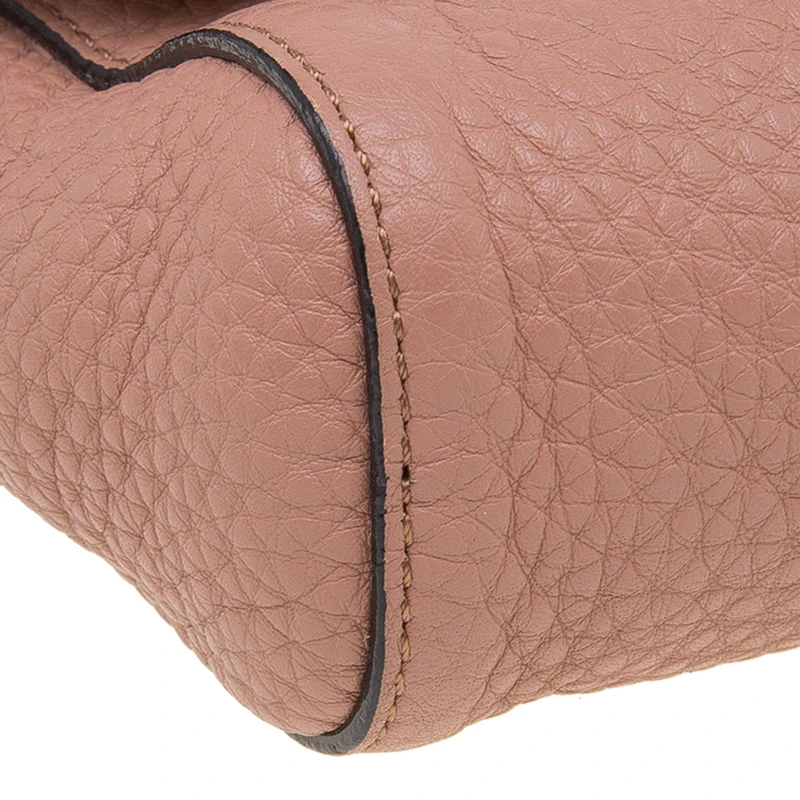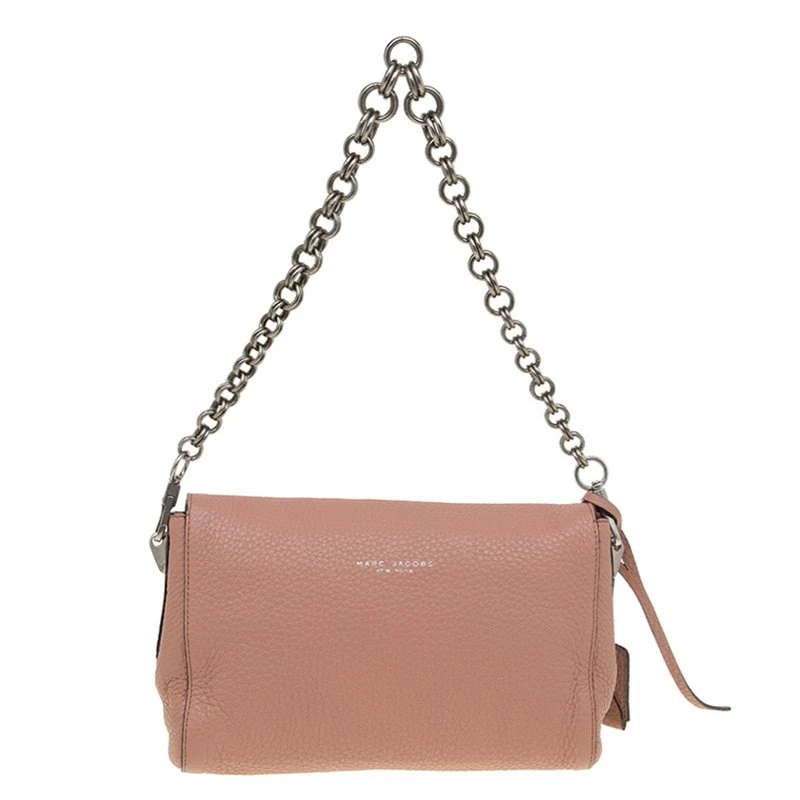 This Marc Jacobs shoulder bag is small and statement-making. Made from rose colored pebbled leather, it has a zipped pocket and push lock on its front flap along with a detachable shoulder strap. The fabric lined interior comes with a zipped pocket. Carry this bag with the gold-tone detachable strap with a top and jeans.