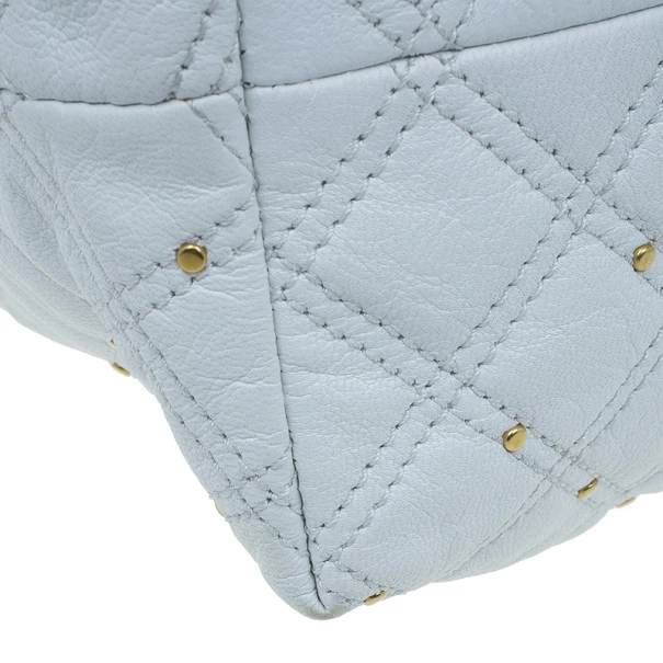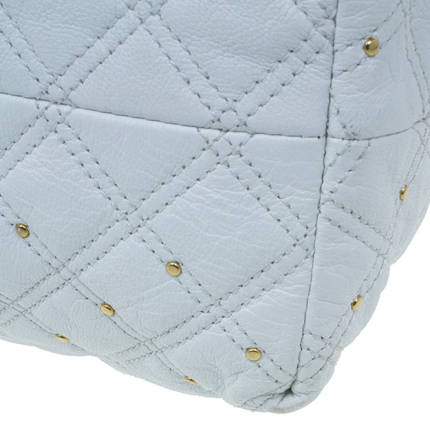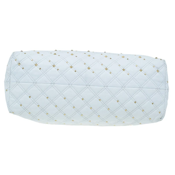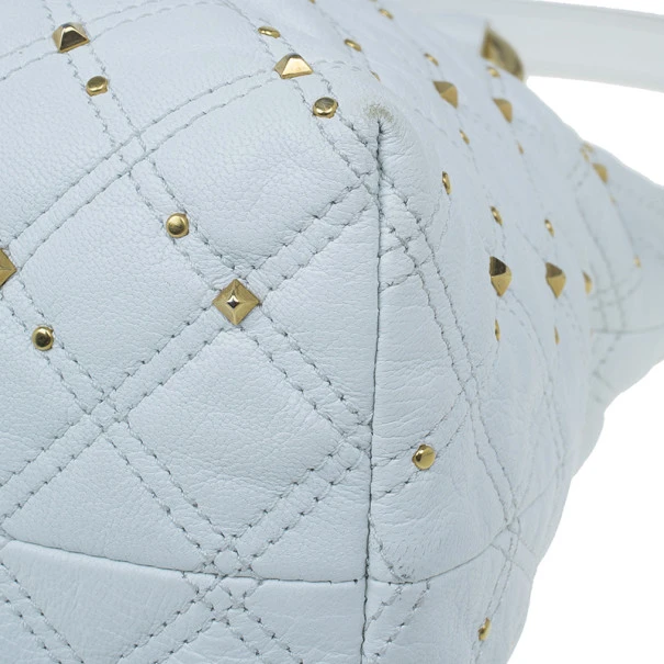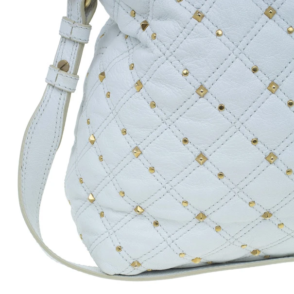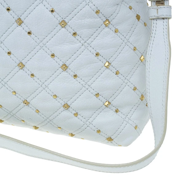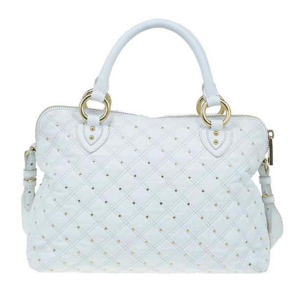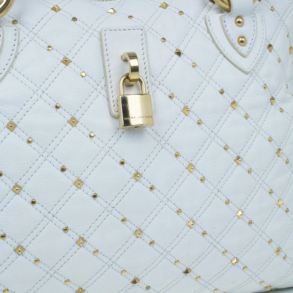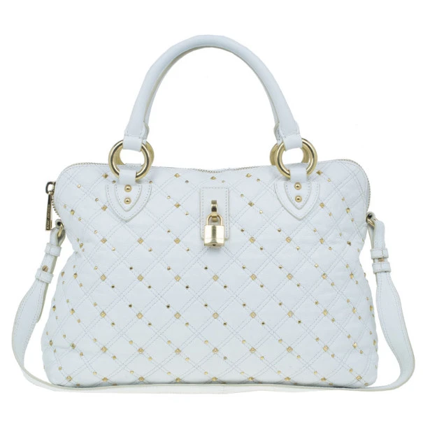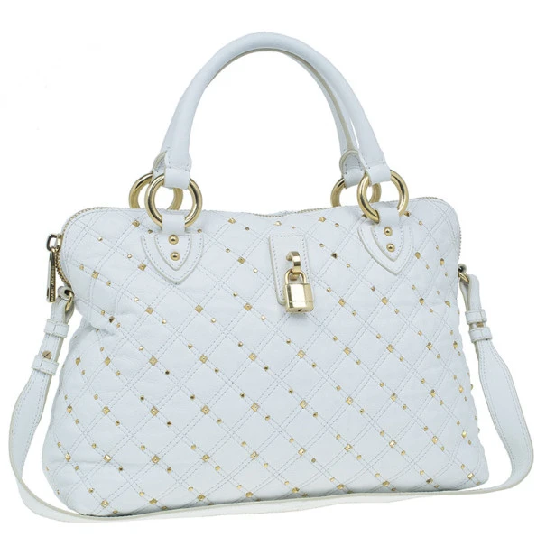 What a great summer arm candy piece this Marc Jacobs white leather studded satchel is! It’s perfect for those chilled out days and would look great with a summer dress or a pair of jeans. The bag features quilting on the leather exterior with gorgeous subtle studs all over it, two rolled top handles and a detachable satchel. It also has a cute gold-tone lock in the front with the Marc Jacobs logo on it and a top zip closure.Original Retail Price: US $1,395