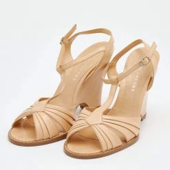 Marc Jacobs Beige Leather And Gold Piping Heart Wedge Ankle Strap Sandals Size 36.5 For Women